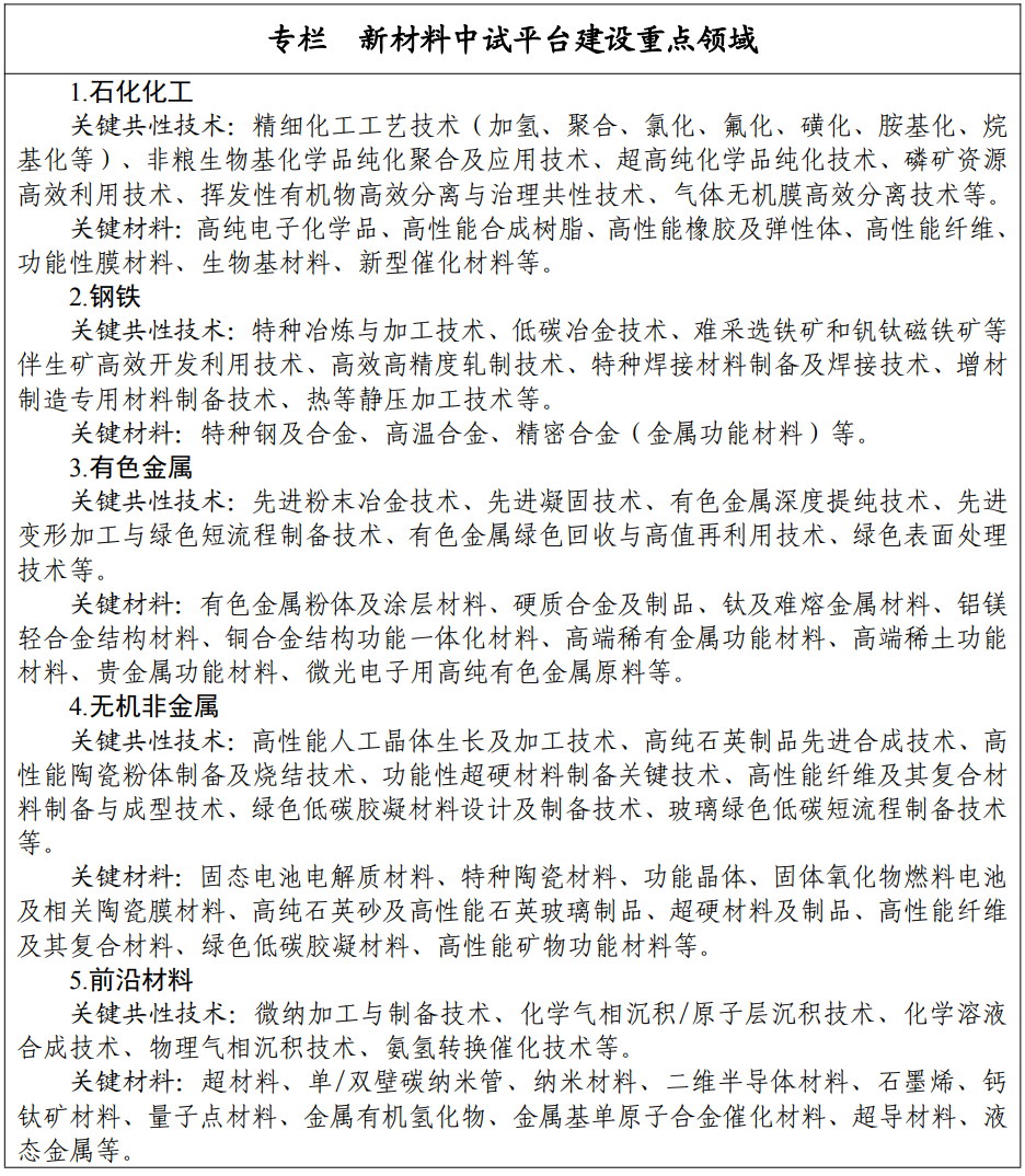 圍繞加快推進(jìn)新型工業(yè)化、建設(shè)制造強(qiáng)國戰(zhàn)略需求,著眼事關(guān)國家安全和經(jīng)濟(jì)建設(shè)的關(guān)鍵短板材料、引領(lǐng)新興產(chǎn)業(yè)和未來產(chǎn)業(yè)發(fā)展的前沿材料,聚焦“觸類旁通”效應(yīng)明顯、行業(yè)進(jìn)步帶動(dòng)性強(qiáng)的關(guān)鍵共性技術(shù),確定新材料中試平臺(tái)建設(shè)的重點(diǎn)領(lǐng)域。