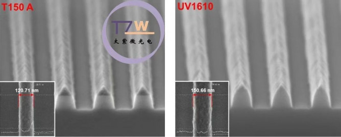 該產(chǎn)品對標(biāo)國際頭部企業(yè)主流KrF光刻膠系列。相較于被業(yè)內(nèi)稱之為“妖膠”的國外同系列產(chǎn)品UV1610,T150 A在光刻工藝中表現(xiàn)出的極限分辨率達(dá)到120nm,且工藝寬容度更大,穩(wěn)定性更高,堅膜后烘留膜率優(yōu)秀,其對后道刻蝕工藝表現(xiàn)更為友好,通過驗證發(fā)現(xiàn)T150 A中密集圖形經(jīng)過刻蝕,下層介質(zhì)的側(cè)壁垂直度表現(xiàn)優(yōu)異。