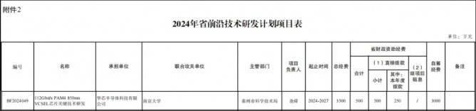 近日,江蘇省財(cái)政廳、江蘇省科學(xué)技術(shù)廳聯(lián)合發(fā)布了《關(guān)于下達(dá)2024年省前沿技術(shù)研發(fā)計(jì)劃資金的通知》。姜堰企業(yè)華芯半導(dǎo)體科技有限公司112Gbit/s PAM4 VCSEL芯片的研發(fā)項(xiàng)目獲批立項(xiàng),為全省首批、全市唯一獲批項(xiàng)目。