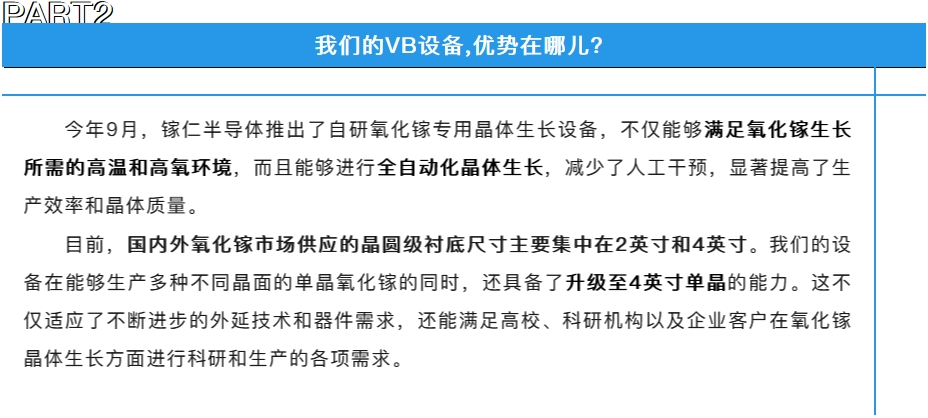 2024年10月,杭州鎵仁半導(dǎo)體有限公司(以下簡(jiǎn)稱鎵仁半導(dǎo)體)在氧化鎵晶體生長(zhǎng)方面實(shí)現(xiàn)新的技術(shù)突破,基于自主研發(fā)的氧化鎵專用晶體生長(zhǎng)設(shè)備(非銥坩堝),采用垂直布里奇曼法(VB)成功生長(zhǎng)出2英寸氧化鎵單晶,在國(guó)內(nèi)尚屬首次。