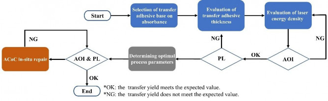 針對超高像素密度Micro-LED全彩顯示屏對芯片激光巨量轉(zhuǎn)移定位精度與良率的嚴苛要求,團隊提出一種激光巨量轉(zhuǎn)移過程的多因子關(guān)聯(lián)決策方案,如圖3所示。包括:1)基于激光與轉(zhuǎn)移膠相互作用模式,對轉(zhuǎn)移膠類型選擇進行綜合評判;2)激光能量范圍與轉(zhuǎn)移膠厚度關(guān)聯(lián)調(diào)控,確保在無損傷情況下實現(xiàn)芯片的高精度、高良率轉(zhuǎn)移;3)采用自動光學(xué)檢測(AOI)/PL檢測定位,對不良芯片進行原位修復(fù)。