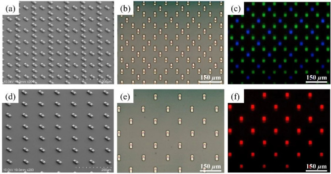 圖4(a)GB-ACoC部分芯片排列的SEM圖像(側(cè)視圖);(b)GB-ACoC芯片的光學(xué)顯微鏡圖像;(c)與(b)圖同視場下芯片PL顯微鏡圖像;(d)R-ACoC部分芯片排列的SEM圖像(側(cè)視圖);(e)R-ACoC芯片的光學(xué)顯微鏡圖像;(f)與(e)圖同視場下芯片PL顯微鏡圖像