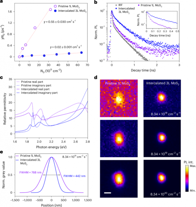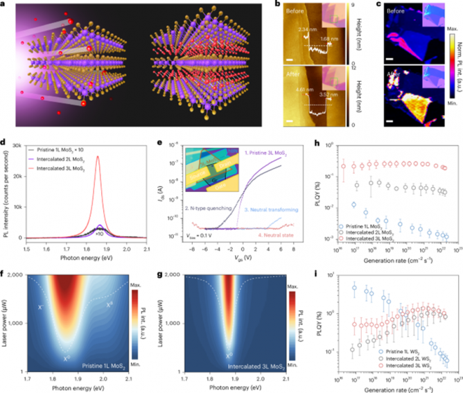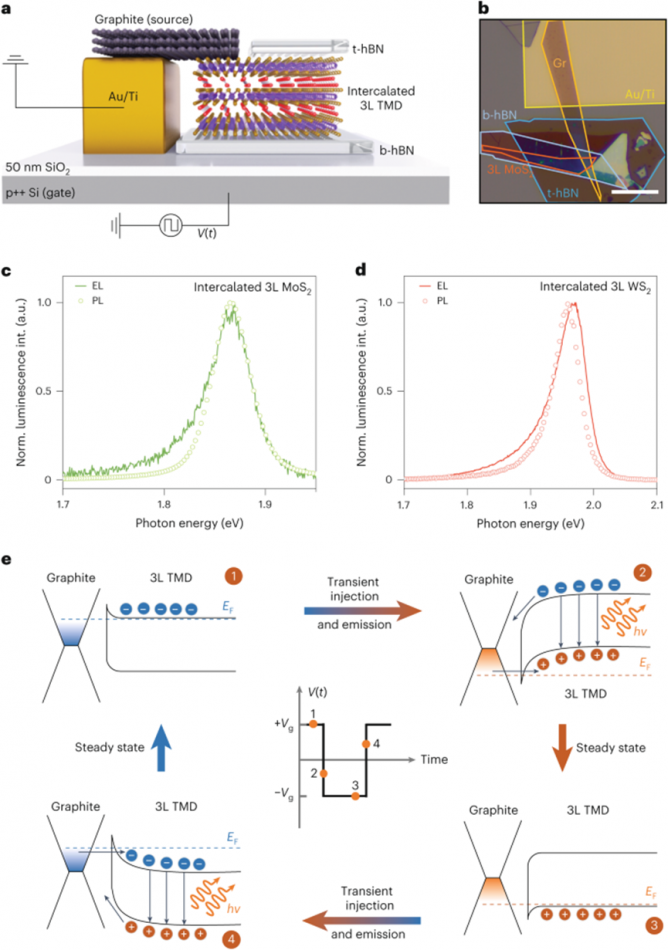 鑒于此,東南大學(xué)章琦,呂俊鵬以及倪振華等人攜手在“Nature Electronics”期刊上發(fā)表了題為“Light-emitting diodes based on intercalated transition metal dichalcogenides with suppressed efficiency roll-off at high generation rates”的最新論文。該團(tuán)隊(duì)通過(guò)氧等離子體插層的方式,制備了基于少層二硫化鉬(MoS2)和二硫化鎢(WS2)的脈沖發(fā)光二極管(LED)。這種氧插層工藝成功地在層間插入氧原子,使得緊密堆疊的少層結(jié)構(gòu)形成類(lèi)量子阱的超晶格結(jié)構(gòu),從而抑制了激子–激子相互作用,并提高了發(fā)光亮度。利用插層后的少層TMDs器件,顯著提高了量子效率,實(shí)現(xiàn)了在高激子生成率下無(wú)效率下降的電致發(fā)光。通過(guò)光譜測(cè)量,研究人員發(fā)現(xiàn),插層工藝降低了激子玻爾半徑和擴(kuò)散系數(shù),從而有效抑制了EEA效應(yīng)。