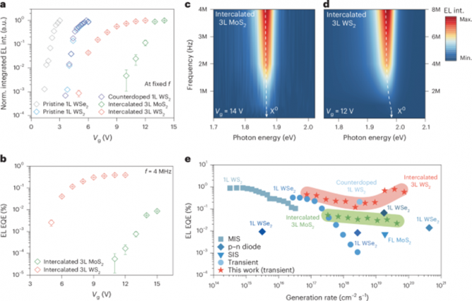 該研究展示了基于插層TMDs的新型LED在發(fā)光性能上的提升,在高激子生成率約1020 cm−2 s−1時(shí),二硫化鉬和二硫化鎢的外量子效率分別達(dá)到了0.02%和0.78%。這一成果為高性能二維LED的設(shè)計(jì)提供了新思路,為二維材料在光電領(lǐng)域的應(yīng)用奠定了基礎(chǔ)。