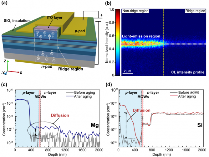 針對(duì)上述問題,本研究團(tuán)隊(duì)制備大功率藍(lán)光GaN單管激光器并基于該器件進(jìn)行了老化測(cè)試分析(圖2)。首次發(fā)現(xiàn)諧振腔面元素?cái)U(kuò)散是導(dǎo)致大功率激光器老化的關(guān)鍵因素,此因素在毫瓦級(jí)激光器中并未發(fā)現(xiàn)。同時(shí),團(tuán)隊(duì)對(duì)多種激光器老化因素進(jìn)行了整合及分析,基于此梳理完善了大功率GaN藍(lán)光激光器老化機(jī)制。