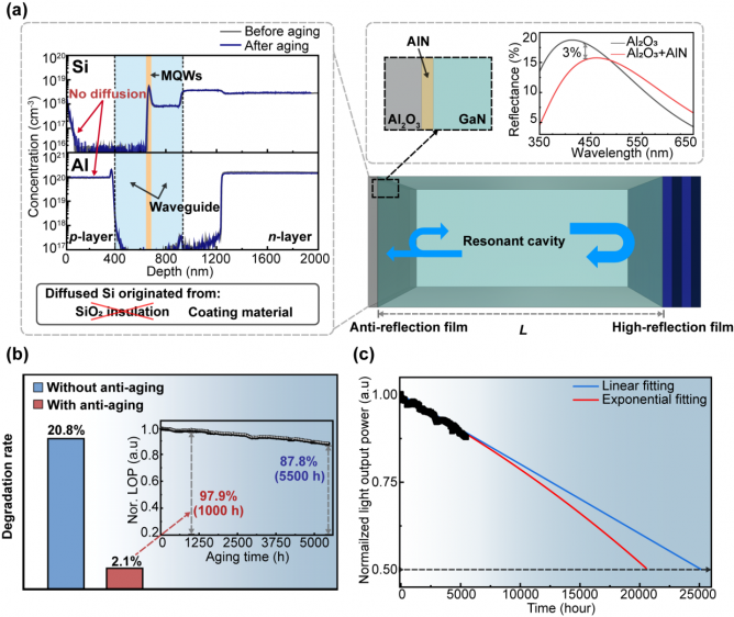 圖3. 抗老化新技術(shù)。a) 技術(shù)原理圖。b) 效果對(duì)比圖。c) 激光器壽命預(yù)測(cè)。