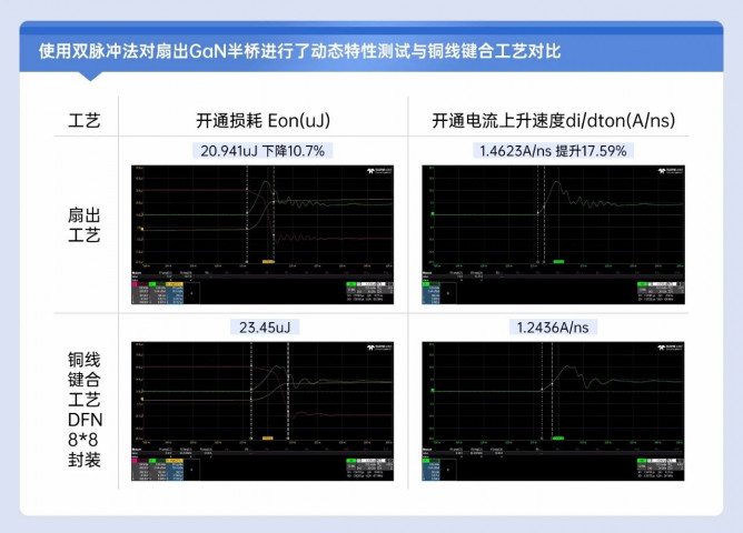 模塊創(chuàng)新采用自主研發(fā)的扇出面板級(jí)封裝形式,其通過(guò)銅球鍵合工藝實(shí)現(xiàn)氮化鎵高電子遷移率晶體管(GaN HEMT)和硅(Si MOS)芯片的凸點(diǎn)結(jié)構(gòu),借助再布線層(RDL)的鍍銅工藝實(shí)現(xiàn)互連,達(dá)到4個(gè)功率管有效互連效果,并形成半橋拓?fù)浣Y(jié)構(gòu),實(shí)現(xiàn)模塊內(nèi)部結(jié)構(gòu)的高密度集成,減少產(chǎn)品體積,提升性能優(yōu)勢(shì),增強(qiáng)產(chǎn)品市場(chǎng)競(jìng)爭(zhēng)力。