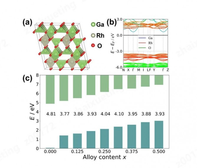 圖二、(a)和(b)分別為銠固溶摩爾比為25%時(shí)的晶體結(jié)構(gòu)及能帶結(jié)構(gòu)圖。(c) 銠固溶氧化鎵β-(RhxGa1-x)2O3在不同摩爾濃度x下的能帶對(duì)齊圖。