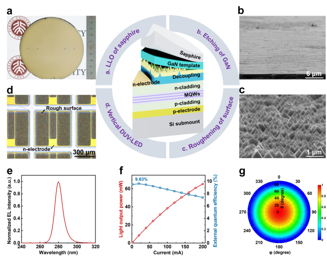 圖a:4英寸深紫外LED外延薄膜的無損傷激光剝離,圖b:GaN模板刻蝕后SEM圖像,圖c:深紫外LED外延薄膜表面糙化SEM圖像,圖d:垂直注入深紫外LED光鏡圖像,圖e:器件電致發(fā)光光譜,圖f:器件出光功率及外量子效率,圖g:器件出光遠(yuǎn)場(chǎng)分布。