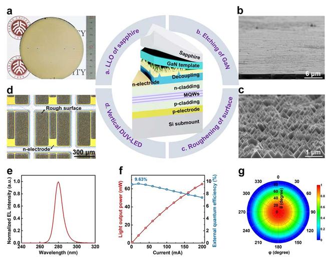 針對(duì)深紫外LED電光轉(zhuǎn)換效率低下的難題,北京大學(xué)團(tuán)隊(duì)提出了一種基于GaN/藍(lán)寶石模板的深紫外LED制備新技術(shù)路線,通過高Al組分AlGaN層預(yù)置裂紋,實(shí)現(xiàn)器件結(jié)構(gòu)層與GaN層的應(yīng)力解耦,得到表面無裂紋的深紫外LED晶圓,同時(shí)預(yù)置裂紋可有效緩沖剝離過程中的局部應(yīng)力。該技術(shù)路線充分利用了Ga金屬滴在激光剝離過程中為液態(tài)的優(yōu)點(diǎn),采用常規(guī)的355 nm短波長(zhǎng)激光器實(shí)現(xiàn)了深紫外LED外延結(jié)構(gòu)2-4英寸晶圓級(jí)無損傷剝離,并成功制備出垂直注入器件,200 mA注入電流下,發(fā)光波長(zhǎng)280 nm的深紫外LED光輸出功率達(dá)65.2mW。相關(guān)成果發(fā)表于《Nature Communications》上。