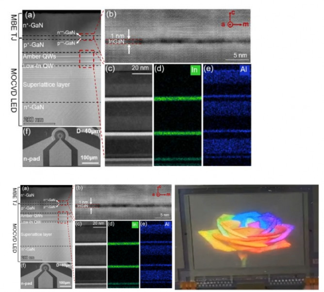 南京大學(xué)、廈門大學(xué)、合肥工業(yè)大學(xué)和沙特阿卜杜拉國(guó)王科技大學(xué)聯(lián)合攻關(guān)氮化鎵基高銦組分紅光材料及其Micro-LED器件技術(shù),采用分子束外延制備出高電注入效率的隧道結(jié)紅光Micro-LED器件。相關(guān)成果發(fā)表在《Applied Physics Letters》上,并選為Editor’s Pick。進(jìn)一步與天馬微電子公司合作,研制出國(guó)際上第一塊基于銦鎵氮基紅綠藍(lán)Micro-LED芯片的1.63寸、像素密度達(dá)403 PPI的TFT驅(qū)動(dòng)全彩顯示屏,完成了Micro-LED全彩顯示方案的新技術(shù)驗(yàn)證。