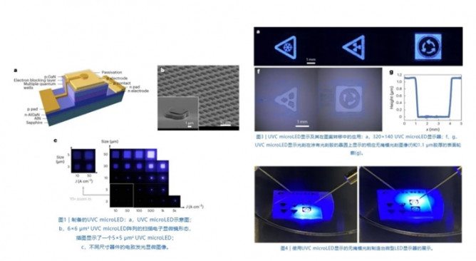 香港科技大學(xué)、南方科技大學(xué)、國(guó)家第三代半導(dǎo)體技術(shù)創(chuàng)新中心(蘇州)、思坦科技等單位通過長(zhǎng)期聯(lián)合攻關(guān),基于高功率密度、高像素密度、低功耗的深紫外Micro-LED顯示芯片實(shí)現(xiàn)了深紫外Micro-LED無掩膜光刻技術(shù),搭建了無掩膜光刻原型機(jī)平臺(tái)并制備首個(gè)深紫外Micro-LED無掩膜曝光的Micro-LED器件,將紫外光源和掩膜板圖案融為一體,在短時(shí)間內(nèi)為光刻膠曝光提供足夠的輻照劑量,為產(chǎn)業(yè)發(fā)展開創(chuàng)了一條新路徑,相關(guān)成果發(fā)表在《Nature Photonics》。
