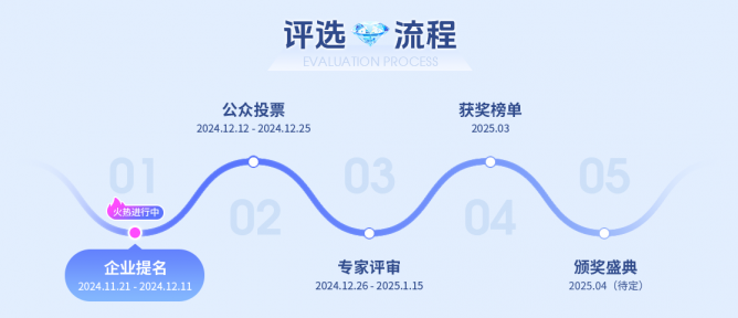 11月21日至12月11日為企業(yè)提名階段,所有符合參選標(biāo)準(zhǔn)的企業(yè)可通過活動(dòng)PC端、移動(dòng)端自由提名,提名成功即可入圍公眾投票環(huán)節(jié)。最終按公眾投票環(huán)節(jié)(40%)+專家最終評(píng)審(40%)+增值分(20%)綜合權(quán)重排名得分,評(píng)選出最終獲獎(jiǎng)企業(yè)。獲獎(jiǎng)名單將于2025年3月進(jìn)行線上全網(wǎng)公布,同時(shí)舉辦頒獎(jiǎng)盛典,現(xiàn)場(chǎng)為獲獎(jiǎng)企業(yè)頒發(fā)獎(jiǎng)牌。