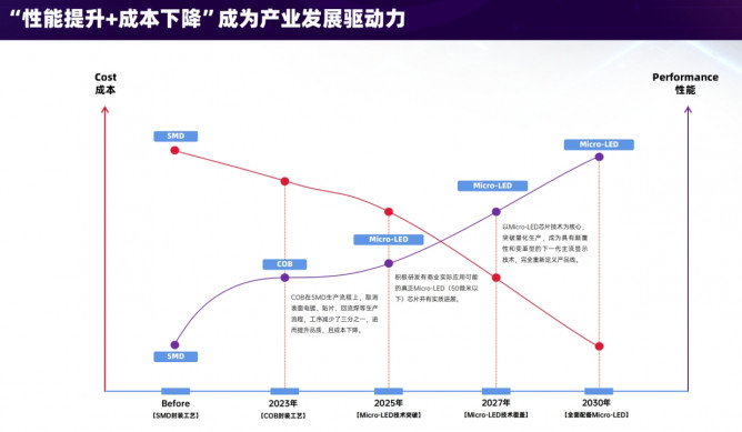隨著P1.5以下產(chǎn)品的滲透以及Micro-LED的市場熱度,COB的市場占有率也在逐漸提高,品牌活躍度不斷提高,未來呈快速增長之勢。受技術(shù)突破、成本降低、產(chǎn)業(yè)鏈進(jìn)步等因素的推動(dòng)下,LED顯示向集成化方向發(fā)展,預(yù)計(jì)MicroLED在未來三年出現(xiàn)重大進(jìn)步。Micro-LED關(guān)鍵技術(shù)突破后,將進(jìn)入Micro-LED集成顯示時(shí)代。“性能提升+成本下降”成為產(chǎn)業(yè)發(fā)展驅(qū)動(dòng)力。