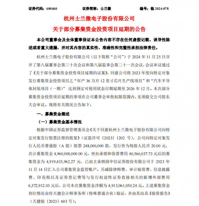 11月25日晚間,士蘭微發(fā)布關(guān)于部分募集資金投資項(xiàng)目延期的公告。根據(jù)公告,公司決定將2023年度向特定對(duì)象發(fā)行募集資金投資項(xiàng)目“年產(chǎn)36萬片12英寸芯片生產(chǎn)線項(xiàng)目”和“汽車半導(dǎo)體封裝項(xiàng)目(一期)”的預(yù)定可使用狀態(tài)日期延期至2026年12月。