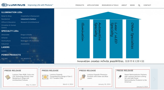 朗明納斯總部位于美國加州硅谷森尼韋爾(Sunnyvale),2002年成立于麻省理工學(xué)院(MIT)/2013年三安全資收購。所生產(chǎn)的LED被廣泛應(yīng)用于醫(yī)療設(shè)備、3D打印、紫外殺菌、高顯色健康照明、植物照明、紅外安防、車載、投影及舞臺娛樂等諸多場景。是超大功率LED芯片及封裝行業(yè)領(lǐng)導(dǎo)者,針對通用照明和特種照明市場,提供豐富的白光及各種單色光解決方案。針對醫(yī)療、投影、車用等高端細(xì)分市場持續(xù)耕耘。提供迅速有效的全球化服務(wù)及技術(shù)支援。2024年正式推出激光產(chǎn)品線系列產(chǎn)品。