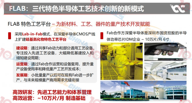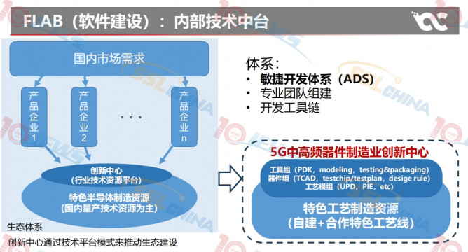 國(guó)家5G中高頻器件創(chuàng)新中心的核心任務(wù)加速新材料/工藝/器件從中試到量產(chǎn)商用,創(chuàng)新地提出Lab-in-Fab的技術(shù)創(chuàng)新模式(簡(jiǎn)稱FLAB模式):在成熟的量產(chǎn)工藝線上建設(shè)三代半導(dǎo)體特色工藝線,并結(jié)合創(chuàng)新中心的內(nèi)部技術(shù)中臺(tái)支持合作伙伴的客制化特色半導(dǎo)體量產(chǎn)工藝創(chuàng)新,在業(yè)界首創(chuàng)地提出“0.49”開(kāi)發(fā)業(yè)務(wù)邊界內(nèi),賦能合作伙伴-特色半導(dǎo)體技術(shù)創(chuàng)新型企業(yè)和機(jī)構(gòu),助力伙伴在無(wú)沉默成本投入的條件下同時(shí)擁有專(zhuān)有工藝/產(chǎn)品創(chuàng)新能力與成熟工藝平臺(tái)的量產(chǎn)能力。