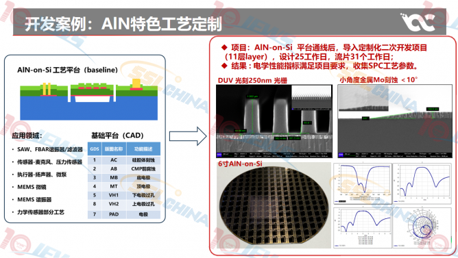國(guó)家5G中高頻器件創(chuàng)新中心在此模式下推進(jìn)技術(shù)資源平臺(tái)化/技術(shù)開(kāi)發(fā)流程化/技術(shù)能力工具化,建成業(yè)界領(lǐng)先的硅基GaN有源器件和硅基AlN無(wú)源器件的模塊化基線工藝平臺(tái),全流程的工具鏈支持和量產(chǎn)加速工具包, 為合作伙伴的定制化工藝和器件開(kāi)發(fā)提供了前所未有的技術(shù)創(chuàng)新體驗(yàn)。例如,在創(chuàng)新中心的硅基AlN無(wú)源器件的模塊化基線工藝平臺(tái)上,莫合作伙伴聚焦器件結(jié)構(gòu)創(chuàng)新和先進(jìn)工藝模塊定制開(kāi)發(fā),包括DUV先進(jìn)光刻工藝和小角度的金屬薄膜刻蝕工藝,在兩個(gè)月內(nèi)實(shí)現(xiàn)一種11層光刻的高頻濾波器器件的原型開(kāi)發(fā),并啟動(dòng)SPC統(tǒng)計(jì)工藝控制的數(shù)據(jù)收集。