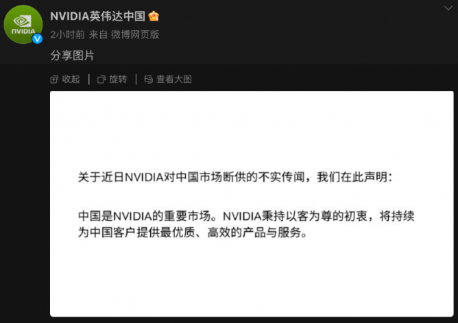 12月12日,英偉達(dá)中國官方微博發(fā)布聲明稱,近日社交媒體上傳英偉達(dá)斷供中國為不實(shí)傳聞,中國是NVIDIA重要的市場,NVIDIA秉持以客為尊的初衷,將持續(xù)為中國客戶提供最優(yōu)質(zhì)、高效的產(chǎn)品與服務(wù)。