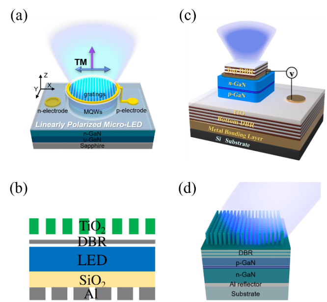 圖1:光場調(diào)控Micro-LED示意圖(更多數(shù)據(jù)可查閱對應文獻)(a)線偏振Micro-LED;(b)圓偏振Micro-LED;(c)諧振腔Micro-LED;(d)指向發(fā)光Micro-LED;