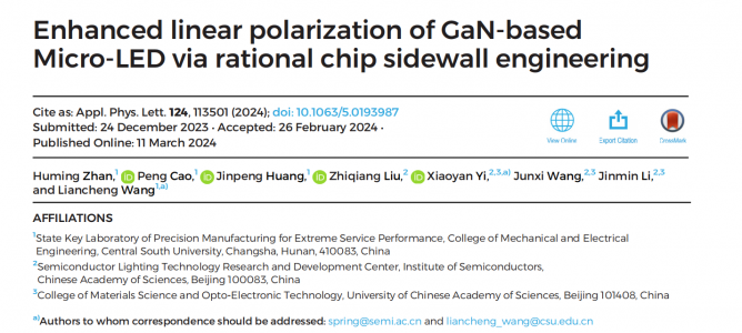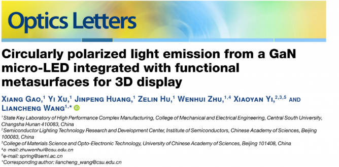 中南大學汪煉成聯(lián)合中科院半導體研究所、湖南大學團隊等近年一直致力原位集成超表面光場調(diào)控Micro-LED器件研究。11月19-21日,其相關成果在蘇州舉行的第十屆國際第三代半導體論壇(IFWS 2024)上報道:通過鍵合、CMP等工藝,首次提出并實現(xiàn)垂直結構F-P諧振腔Mini/Micro-LED器件,光譜半高寬從常規(guī)24nm減小到15nm,發(fā)光方向性提高16.4%【Applied Physics Letters 121.20(2022)】;通過原位集成亞波長金屬光柵,首次報道線偏振Micro-LED,TM/TE=6.2倍,等效消光比為14dB,并通過沉積介質(zhì)膜和反射鏡側壁工程,進一步提高偏振比【Applied Physics Letters 122.11(2023);Applied Physics Letters 124.11(2024)】;首次提出圓偏振Micro-LED,橫電波反射率超過80%,消光比達到38 dB以上【Optics Letters 46.11 (2021): 2666-2669】;首次設計報道指向發(fā)光Micro-LED,實現(xiàn)高效率寬角度范圍指向出光,以及任意角度出光和雙角度指向出光【Optics Letters 46.14 (2021): 3476-3479】。
