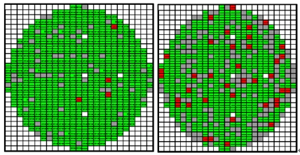 圖3 在VGS= -4V和在VDS=1200V條件下的6英寸晶圓上制作的器件的IGSS分布圖(綠色為通過(guò),圖a良率為90%,圖b良率為70%)