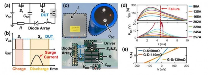 (a) 為電路原理圖;(b) 為理想波形;(c) 為浪涌電流測(cè)試裝置照片;(d) 為被測(cè)件在不同浪涌電流水平下的電流和電壓波形;(e) 失效被測(cè)件的引腳間電阻