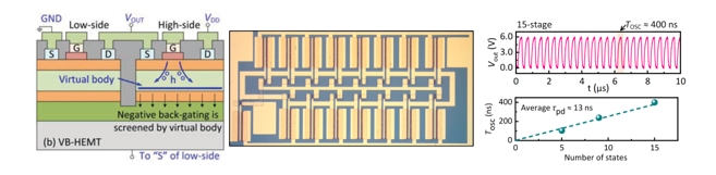 單芯片集成技術(shù)是提升GaN基功率芯片高頻特性的主要技術(shù)路徑,該技術(shù)長期受限于高壓信號的串擾效應(yīng)及p溝道晶體管的低電流密度。該團隊創(chuàng)新提出了虛體隔離技術(shù),利用移動空穴巧妙實現(xiàn)了對高壓信號的屏蔽。該工作在國際上首次實現(xiàn)了650V Si基GaN高壓集成芯片(IEDM, 2023, Sec.9-6);該團隊創(chuàng)新提出了極化增強電離概念,大幅提升了p溝道晶體管的電流密度,實現(xiàn)了國際上傳輸延遲最小的GaN基CMOS集成電路芯片(IEDM, 2024, Sec.16-1)。