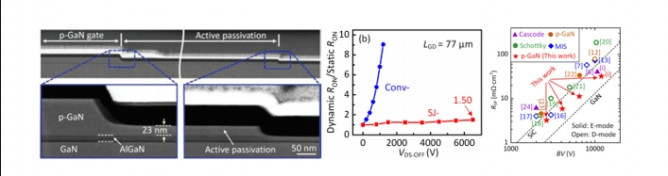超高壓GaN基功率器件的發(fā)展長期受限于高場陷阱效應(yīng)所引起的動態(tài)電阻退化以及電場聚集效應(yīng)引起的提前擊穿。針對上述難題,該團隊提出了新型有源鈍化晶體管,實現(xiàn)了擊穿電壓大于1萬伏的增強型GaN基功率器件,在高達6500V工作電壓下實現(xiàn)了對動態(tài)電阻的抑制。這是國際上首次報道GaN基功率器件在2kV以上的低動態(tài)導(dǎo)通電阻特性,器件品質(zhì)因數(shù)為國際報道最高值(IEDM, 2023, Sec.26-1; IEDM, 2024, Sec.25-3)。