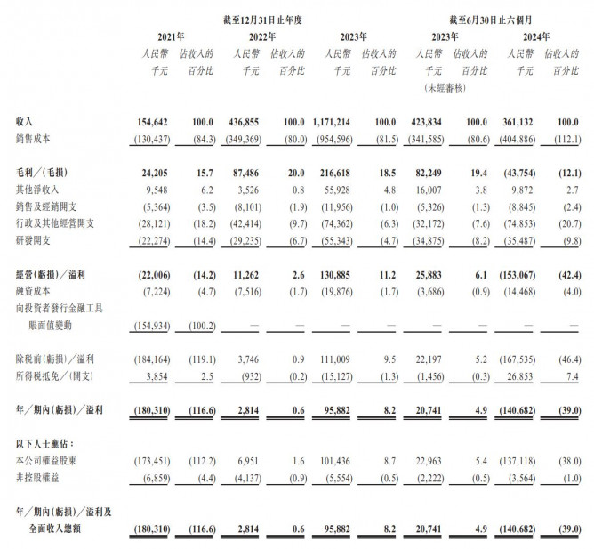 財(cái)務(wù)方面,于2021年度、2022年度、2023年度、2024年截至6月30日止六個(gè)月,天域半導(dǎo)體收入分別約為人民幣1.55億元、4.37億元、11.71億元、3.61億元;同期,該公司年內(nèi)毛利分別約為2420.5萬元、8748.6萬元、2.17億元、-4375.4萬元。