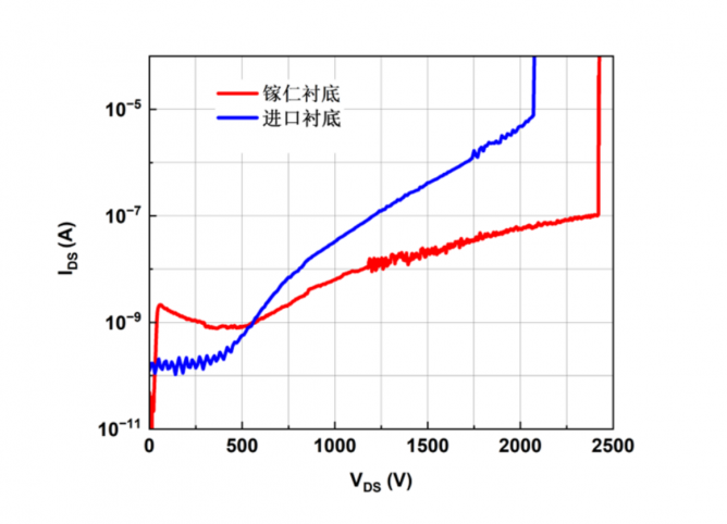 基于鎵仁半導(dǎo)體提供的(010)面氧化鎵半絕緣襯底,下游器件客戶實(shí)現(xiàn)了開關(guān)比大于10的7次方,擊穿電壓高達(dá)2429V的增強(qiáng)型晶體管,器件柵漏間距30 μm,柵寬3 μm,關(guān)態(tài)漏電~10-7mA/mm,在同等條件下,鎵仁襯底的器件指標(biāo)顯著優(yōu)于進(jìn)口襯底的器件驗(yàn)證結(jié)果(2080V)。