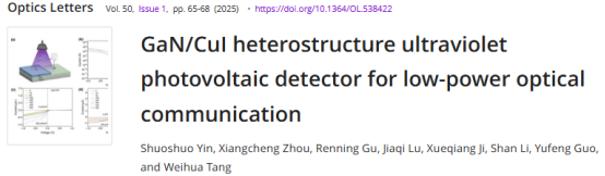 紫外光探測器(UVPD)因其能夠?qū)⒆贤猓║V)光信號轉(zhuǎn)換為可檢測的電信號,在生物醫(yī)學(xué)測試、導(dǎo)彈預(yù)警、空間探索、火焰檢測和安全通信等多個領(lǐng)域具有重要應(yīng)用。特別是在光通信系統(tǒng)中,UVPD作為光學(xué)接收器,能夠增強系統(tǒng)的抗干擾能力、實現(xiàn)非視距通信和防止信號截獲。因此,高性能UVPD的開發(fā)對于紫外通信技術(shù)的發(fā)展至關(guān)重要。研究者們已經(jīng)探索了多種寬帶隙半導(dǎo)體材料,包括GaN、Ga2O3、ZnO、TiO2和SiC,用于UVPD的制造,這些材料因其特定的響應(yīng)波帶、高光電轉(zhuǎn)換效率和高靈敏度而受到青睞。此外,金屬-半導(dǎo)體-金屬(MSM)、肖特基結(jié)和異質(zhì)結(jié)等器件配置也被廣泛研究并應(yīng)用于紫外光通信系統(tǒng)。本文中,研究者們構(gòu)建了一種基于GaN/CuI異質(zhì)結(jié)的自供能UVPD。