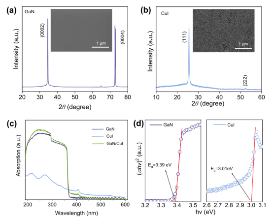 圖1 GaN和CuI薄膜的晶體結(jié)構(gòu)、表面形貌及光學(xué)特性分析
