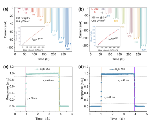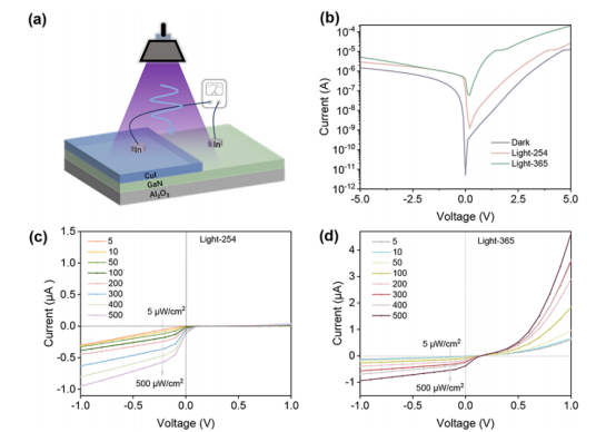 南京郵電大學(xué)唐為華團隊通過旋涂法構(gòu)建了一種平面結(jié)構(gòu)的GaN/CuI異質(zhì)結(jié)紫外光電探測器(UVPD),以自供能方式工作。設(shè)計的GaN/CuI光電探測器能夠精確檢測UVA和UVC波段的光。在365 nm UVA光照射下,我們的光電探測器設(shè)備展現(xiàn)出了良好的自供能光響應(yīng)特性,具有1.3 × 10^3的光-暗電流比(PDCR)、228 mA/W的響應(yīng)度和4.3 × 10^13 Jones的特定探測度,在零偏壓下。即使在空氣中放置五個月而沒有包裝的情況下,光電電流在連續(xù)可靠性測試中幾乎沒有退化。作為光信號接收器,GaN/CuI異質(zhì)結(jié)UVPD在自制光通信系統(tǒng)中解碼了“GOOD”的二進制消息。