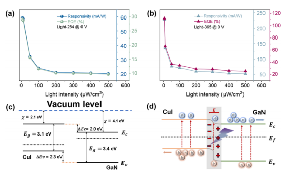 圖4 GaN/CuI異質(zhì)結(jié)紫外光電探測器的光響應(yīng)性能及能帶結(jié)構(gòu)分析