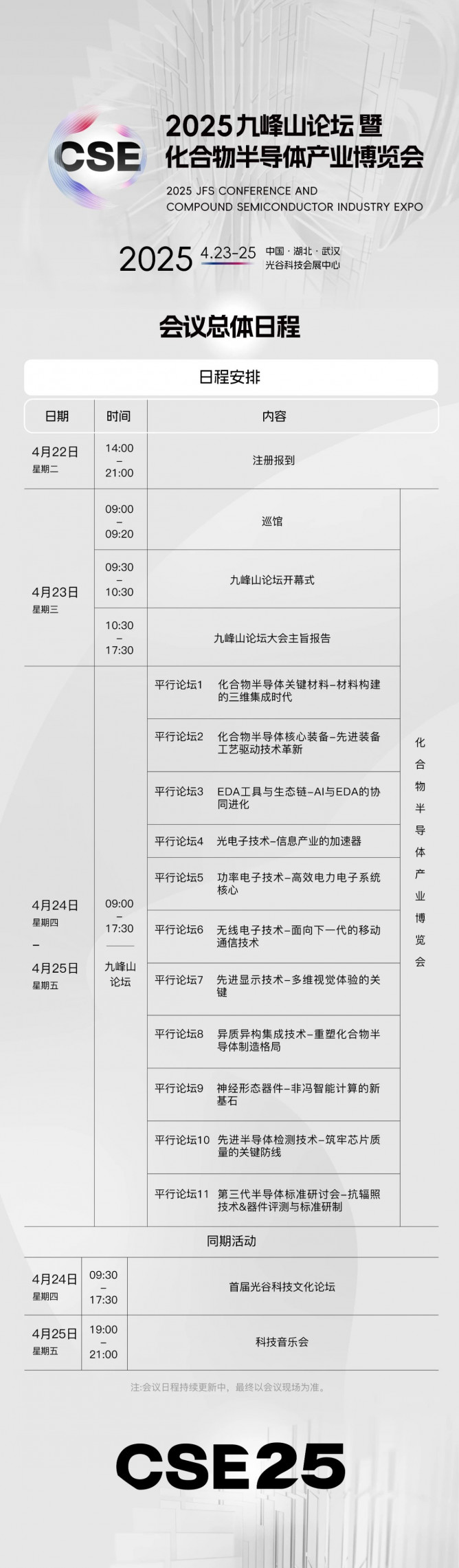 作為化合物半導體產(chǎn)業(yè)博覽會(CSE)的核心組成部分,九峰山論壇(JFSC)不僅是一個展示化合物半導體領域最新研究成果和技術進展的國際舞臺,更是一個促進全球范圍內產(chǎn)學研深度融合的重要平臺。誠摯邀請全球化合物半導體技術領域的專家學者、行業(yè)領航者及創(chuàng)新先鋒蒞臨盛會,發(fā)表精彩演講,共享智慧火花,攜手點亮化合物半導體行業(yè)的輝煌未來。