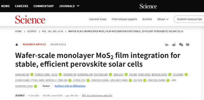 Huachao Zai†, Pengfei Yang†, Jie Su†, Ruiyang Yin†, Rundong Fan, Yuetong Wu, Xiao Zhu,Yue Ma, Tong Zhou, Wentao Zhou, Yu Zhang, Zijian Huang, Yiting Jiang, Nengxu Li, Yang Bai,Cheng Zhu, Zhaohui Huang, Jingjing Chang, Qi Chen, Yanfeng Zhang*, Huanping Zhou*, Wafer-scale monolayer MoS2 film integration for stable, efficient perovskite solar cells