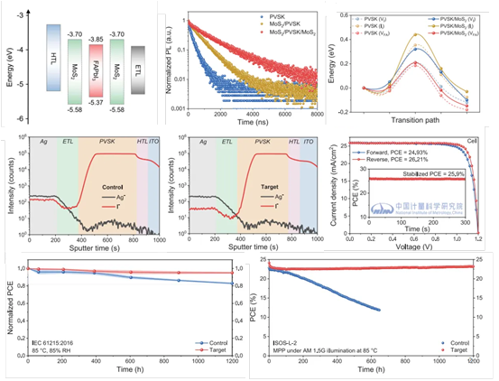 鑒于此,西安電子科技大學(xué)集成電路學(xué)部的常晶晶教授和蘇杰副教授與北京大學(xué)周歡萍教授和張艷鋒教授等人提出利用晶圓級(jí)連續(xù)單層MoS2插入鈣鈦礦/電子傳輸層和鈣鈦礦/空穴傳輸層界面,通過(guò)物理方法阻斷鈣鈦礦離子向傳輸層遷移,并通過(guò)強(qiáng)配位相互作用在化學(xué)上穩(wěn)定甲酰胺鉛碘化物相。同時(shí)利用Pb-S鍵有效鈍化鈣鈦礦表面態(tài)和利用I型能帶排布有效阻擋少數(shù)載流子傳輸。最終使得具有MoS2/鈣鈦礦/MoS2配置的p-i-n型鈣鈦礦太陽(yáng)能電池及模塊效率分別高達(dá)26.2%和22.8%,高溫(85℃)穩(wěn)定性在1200小時(shí)損失小于4%。