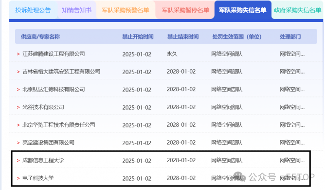 公告明確指出,電子科技大學因串通投標,被網絡空間部隊后勤部采購和資產管理處根據相關規(guī)定,處以自2025年1月2日至2028年1月2日,共計3年內不得參與網絡空間部隊采購活動的處罰。在此期間,該校法定代表人曾勇控股或管理的其他企業(yè)也將受到限制,同時授權代表宋歡歡不得代理其他供應商參與采購活動。同樣,成都信息工程大學也因串通投標行為,面臨與電子科技大學相同的處罰,即3年內禁止參與網絡空間部隊采購活動,且法定代表人余敏明控股或管理的其他企業(yè)受限,授權代表也不得代理其他供應商參加。
