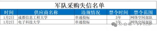 近日,從軍隊采購網采購信息公示欄目獲知,電子科技大學與成都信息工程大學因串通投標行為,被軍方列入了采購失信名單。