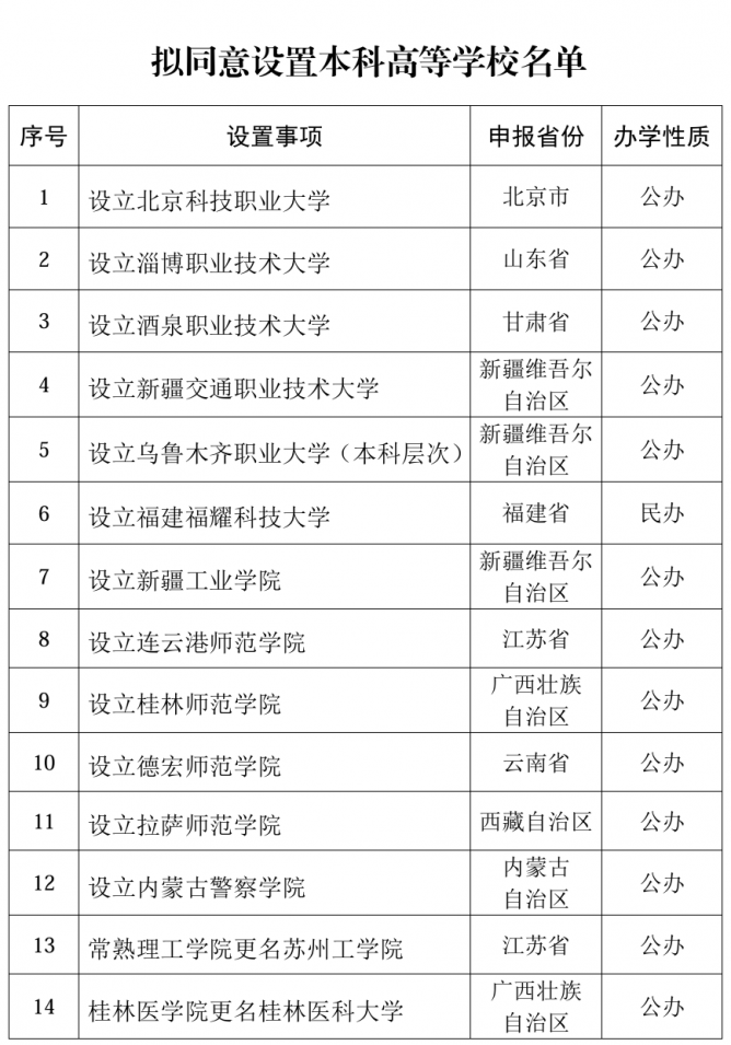 今天,教育部發(fā)展規(guī)劃司發(fā)布《關(guān)于擬同意設(shè)置本科高等學(xué)校的公示》:根據(jù)《中華人民共和國高等教育法》《普通高等學(xué)校設(shè)置暫行條例》《普通本科學(xué)校設(shè)置暫行規(guī)定》《本科層次職業(yè)學(xué)校設(shè)置標(biāo)準(zhǔn)(試行)》等有關(guān)規(guī)定以及第八屆全國高等學(xué)校設(shè)置評(píng)議委員會(huì)考察評(píng)議結(jié)果,經(jīng)教育部黨組會(huì)議審議,擬同意設(shè)置北京科技職業(yè)大學(xué)等14所學(xué)校,現(xiàn)予公示。