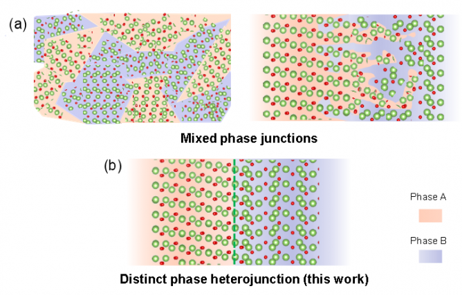 圖1. 示意圖(a)已報(bào)道的混合晶相異質(zhì)結(jié);(b) 本研究中界面清晰的β/κ-Ga2O3晶相異質(zhì)結(jié)