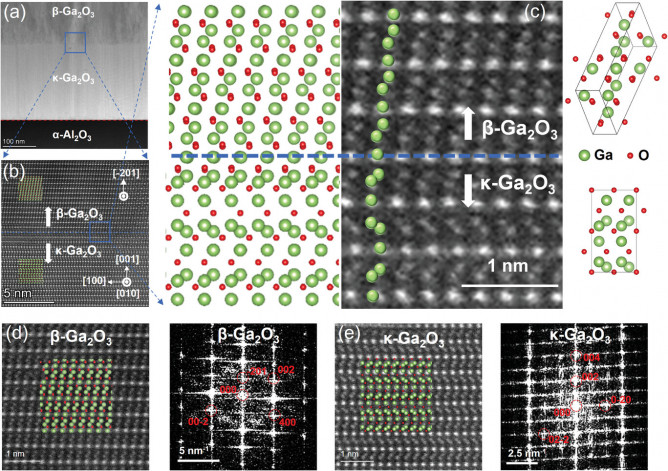 圖3 顯示了κ相Ga2O3與β相Ga2O3的高分辨率TEM圖像,清晰地揭示了原子排列及其清晰的界面(用藍(lán)色虛線曲線標(biāo)示)。圖3(c)提供了β相與κ相Ga2O3界面的放大圖,并疊加了原子模型。單斜晶系β相Ga2O3的晶體模型(空間群#12, C2/m)沿[-201]生長(zhǎng)方向與HR-TEM圖像中的晶格排列很好地匹配。對(duì)于κ相Ga2O3,正交晶系的晶體模型(空間群#33, Pna21沿[010]區(qū)軸也與HR-TEM圖案一致。界面清晰且通過(guò)原子模型準(zhǔn)確映射,展現(xiàn)了從κ相平滑過(guò)渡到β相的β/κ Ga2O3異質(zhì)結(jié).
