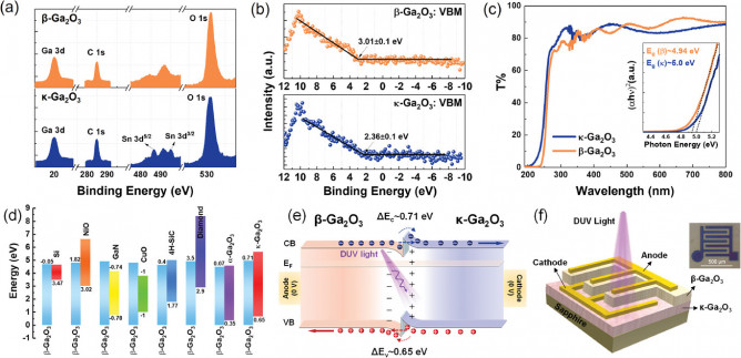 因此,在本研究中,我們展示了一種界面清晰的β/κ Ga2O3晶相異質(zhì)結(jié),其具有II型能帶排列,形成耗盡區(qū)以高效分離電子-空穴對(duì),并實(shí)現(xiàn)自供電的深紫外探測(cè)。圖2可以明顯看出,正交晶系κ-Ga2O3與單斜晶系β-Ga2O3的XRD圖譜存在顯著差異。通過(guò)SIMS測(cè)得的β相/κ相Ga2O3樣品中元素的分布情況,可以發(fā)現(xiàn)Sn和Si的強(qiáng)度在β相和κ相Ga2O3界面處顯著增加。這一現(xiàn)象可歸因于在沉積κ相Ga2O3時(shí)使用的靶材(Ga2O3:SnO2:SiO2,98.4%:1.5%:0.1%,重量比)中含有Si和Sn的成分。Sn的引入具有雙重作用:一方面,在高真空環(huán)境下通過(guò)減少亞氧化物(Ga2O)的刻蝕促進(jìn)了Ga2O3的形成;另一方面,Sn占據(jù)了八面體晶格位置,從而促進(jìn)了κ相的合成。此外,由于Si在Ga2O3中具有兩性行為,特別是在κ相Ga2O3中,Si在κ-Ga2O3中作為受主(或補(bǔ)償劑)而非施主,從而導(dǎo)致κ相Ga2O3表現(xiàn)出高絕緣的特性。