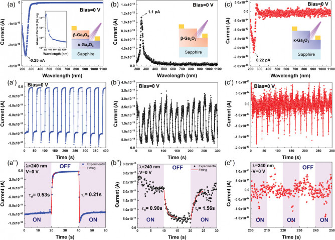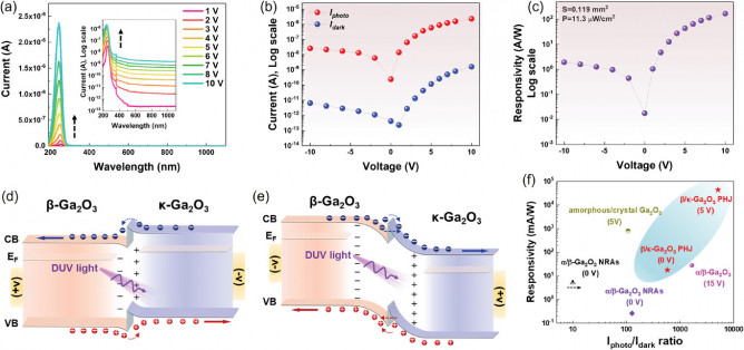 XPS測(cè)試 (圖4)揭示了β-Ga2O3/κ-Ga2O3異質(zhì)結(jié)的II型能帶對(duì)齊,其導(dǎo)帶和價(jià)帶偏移分別為0.71 eV和0.65 eV,表明界面處存在強(qiáng)電場(chǎng)。這種界面電場(chǎng)能夠在無(wú)外加偏壓的情況下有效分離光生電子-空穴對(duì)。這種II型異質(zhì)結(jié)的一個(gè)有前景的應(yīng)用是檢測(cè)日盲深紫外信號(hào),尤其是在自供電模式下。因此,所展示的II型單晶β-Ga2O3/κ-Ga2O3異質(zhì)結(jié),由于其界面電場(chǎng)以及相似的吸收邊,可能在自供電DUV光探測(cè)方面表現(xiàn)出更優(yōu)越的性能。