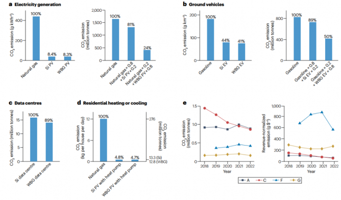 圖5. 第三代半導(dǎo)體以及電力電子在發(fā)電、電動汽車、數(shù)據(jù)中心和建筑物的制冷與供暖等應(yīng)用中的年度碳排放減排效果(美國),以及主流功率半導(dǎo)體公司近年來的碳排放總量以及收入歸一化后的碳排放數(shù)據(jù)。