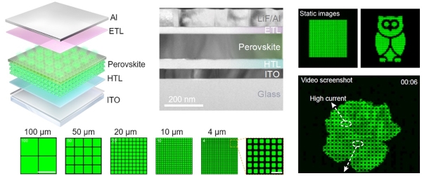 這種晶體薄膜可與電子背平面集成,構(gòu)建Micro LED顯示器,對每個像素進(jìn)行獨立的動態(tài)控制,用于靜態(tài)圖像和視頻顯示。該研究成果為外延鈣鈦礦提供了一個新技術(shù)平臺,可將明亮、高效、均勻的光發(fā)射與LED電子裝置進(jìn)行單片集成,從而制造出像素尺寸小于10μm的超高分辨率Micro LED顯示屏。