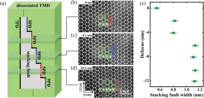 晶體材料中的位錯具有滑移和攀移兩種基本運動方式。由于半導體材料的強共價鍵特性,位錯在半導體中運動主要依賴于位錯芯結構的演化,因此要理解半導體材料中位錯運動演變的動力學規(guī)律,就必須在原子尺度上研究位錯的基本運動過程。在立方結構的半導體硅材料中,位錯滑移主要發(fā)生在晶體生長和加工過程中,通過人們對于原子級位錯滑移動力學的深入研究,最終實現(xiàn)了對位錯的有效控制,成功獲得了迄今所有人工晶體中質量最高的硅單晶材料,極大的推動了半導體集成電路技術和產業(yè)的發(fā)展。而在六方結構的氮化鎵外延生長過程中,位錯主要以攀移方式運動,但至今仍然缺乏對位錯攀移運動的原子級表征和理解。常規(guī)的電鏡技術只能獲得晶體中靜態(tài)的位錯二維投影圖像,要觀測到位錯的原子尺度運動過程依然面臨巨大挑戰(zhàn)。