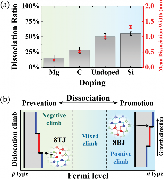 針對上述關鍵科學問題和應用需求,北京大學楊學林、沈波團隊對氮化鎵外延薄膜中位錯的原子尺度攀移過程進行了深入研究。通過采用掃描透射電子顯微鏡(STEM)的深度切片技術,結合精心設計的外延結構調控位錯攀移傾角,使其與STEM的深度分辨率精準匹配,成功捕捉到了單根位錯線的原子級攀移過程,并發(fā)現(xiàn)混合位錯中的5環(huán)不全位錯以“5-9”原子環(huán)循環(huán)交替的方式進行攀移。在此基礎上,合作單位北京計算科學研究中心黃兵團隊利用模擬計算確認了位錯割階的原子結構和電子結構,并提出了“費米能級調控割階形成”的新機制,為“摻雜如何影響位錯攀移”這一問題的理解提供了全新的物理視角。