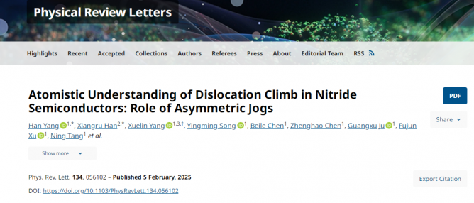 北京大學物理學院凝聚態(tài)物理與材料物理研究所、寬禁帶半導體研究中心、人工微結構和介觀物理國家重點實驗室、納光電子前沿科學中心楊學林、沈波團隊在氮化鎵外延薄膜中位錯的原子級攀移動力學研究上取得重要進展。相關成果2025年2月5日以“從原子尺度上理解氮化物半導體中的位錯攀移:不對稱割階的影響”(Atomistic Understanding of Dislocation Climb in Nitride Semiconductors: Role of Asymmetric Jogs)為題在線發(fā)表于《物理評論快報》(Physical Review Letters)上。